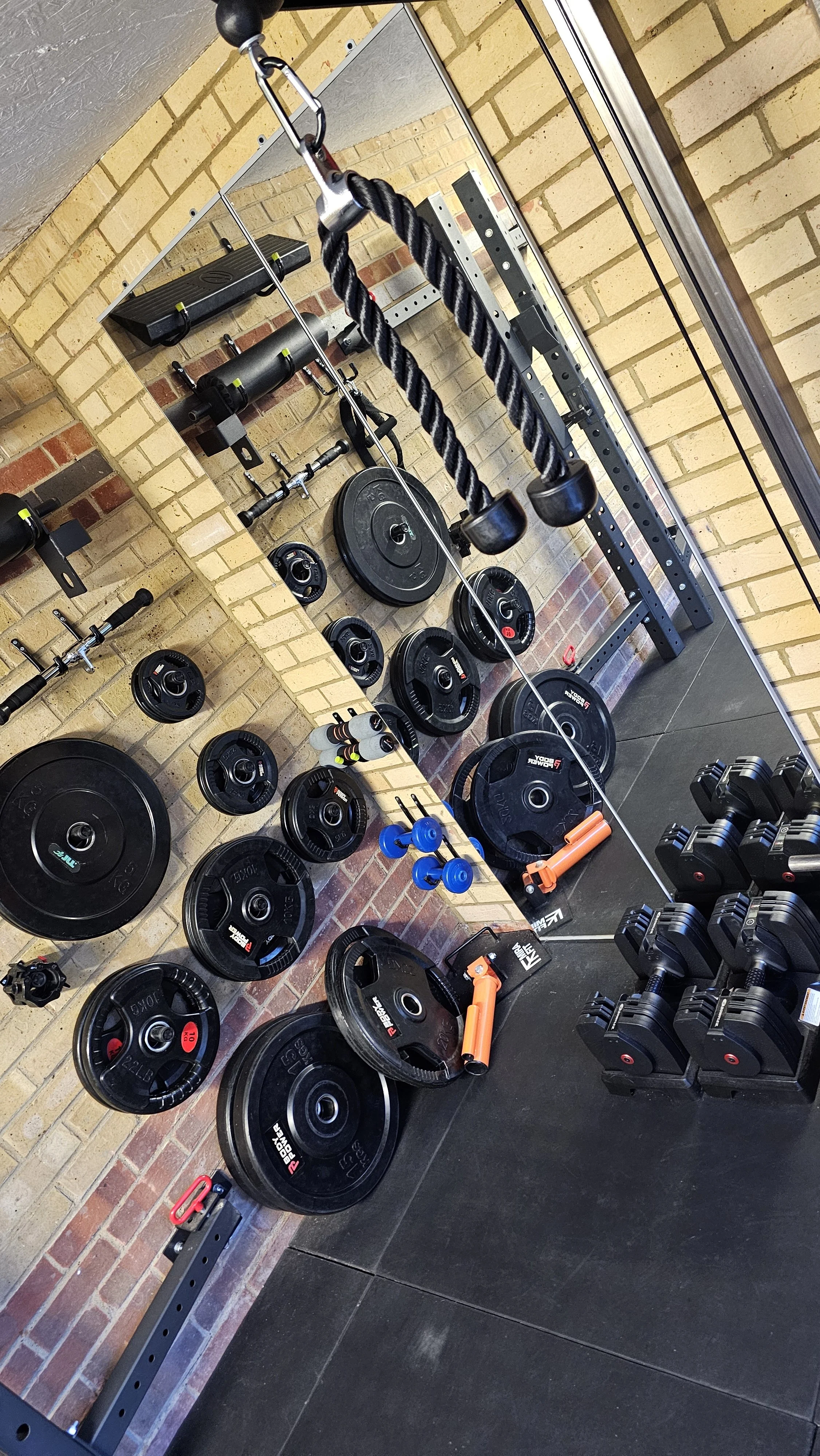 The gym is equipped with a full rack, barbells, weight plates, trap bars, dumbbells, kettlebells, and a pull-up bar.